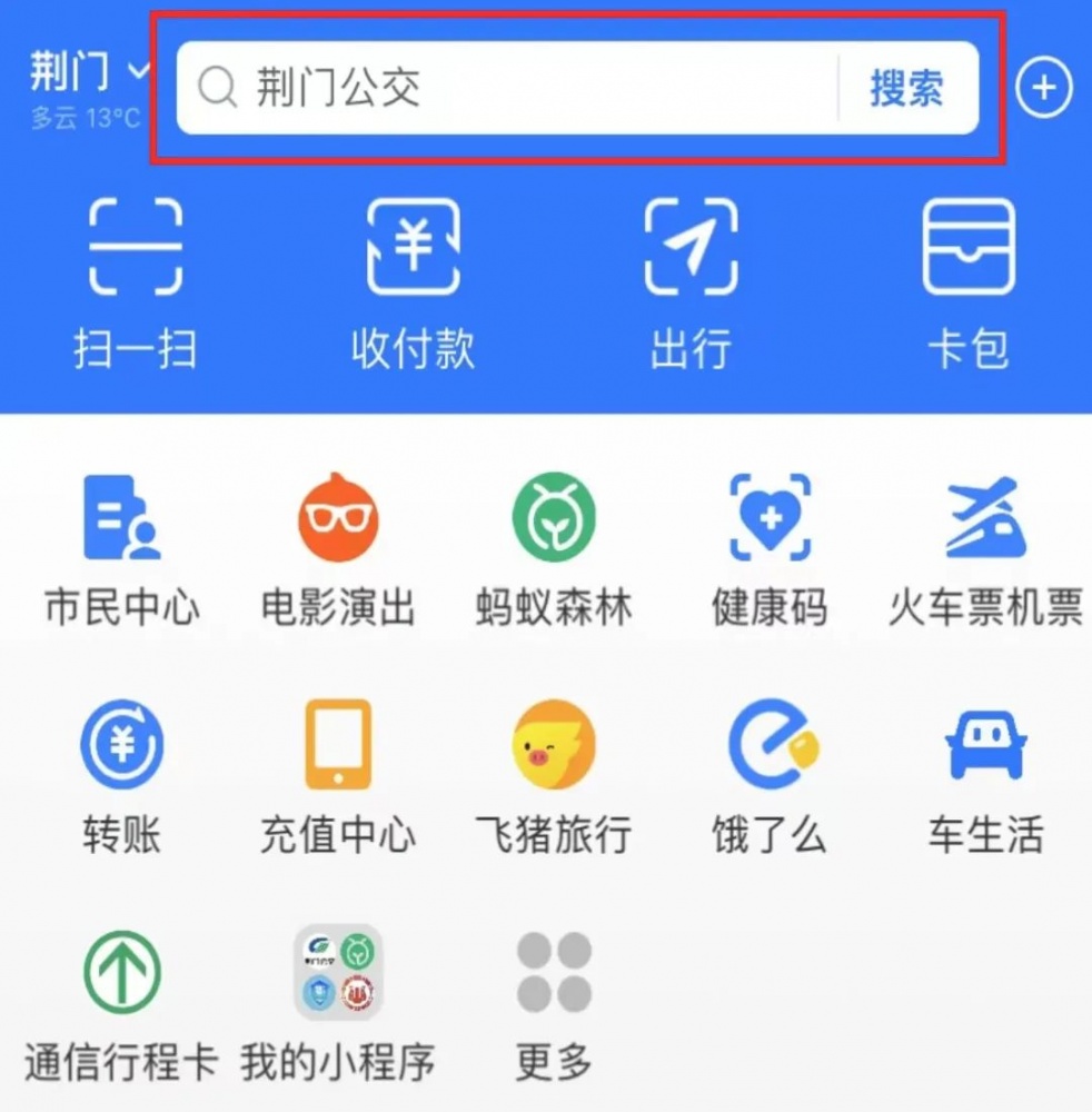 01 打開“支付寶APP”,首頁搜【荊門公交】