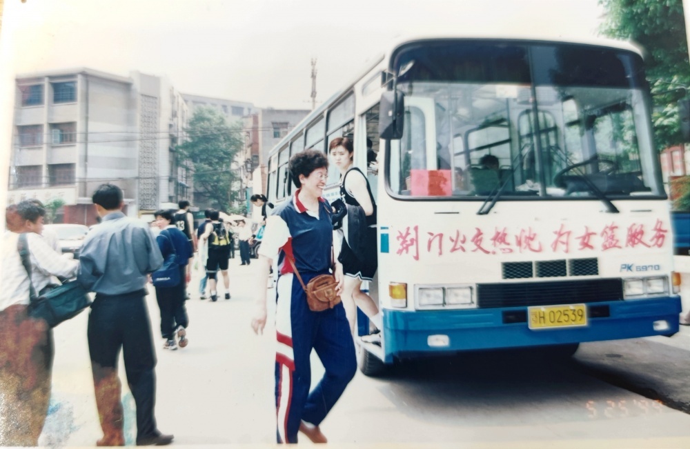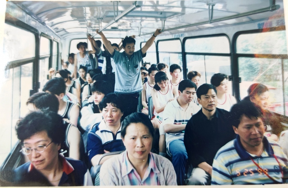 ▲1999年5月25日,沈陽(yáng)電梯隊(duì)隊(duì)員、教練乘坐公交出行。公交車(chē)頭還掛有“荊門(mén)公交熱忱為女籃服務(wù)”橫幅。