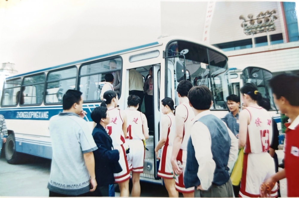 ▲1999年5月25日,到達(dá)荊門(mén)石化體育館。遠(yuǎn)處看女藍(lán)隊(duì)員走過(guò)公交車(chē),個(gè)頭真的高。