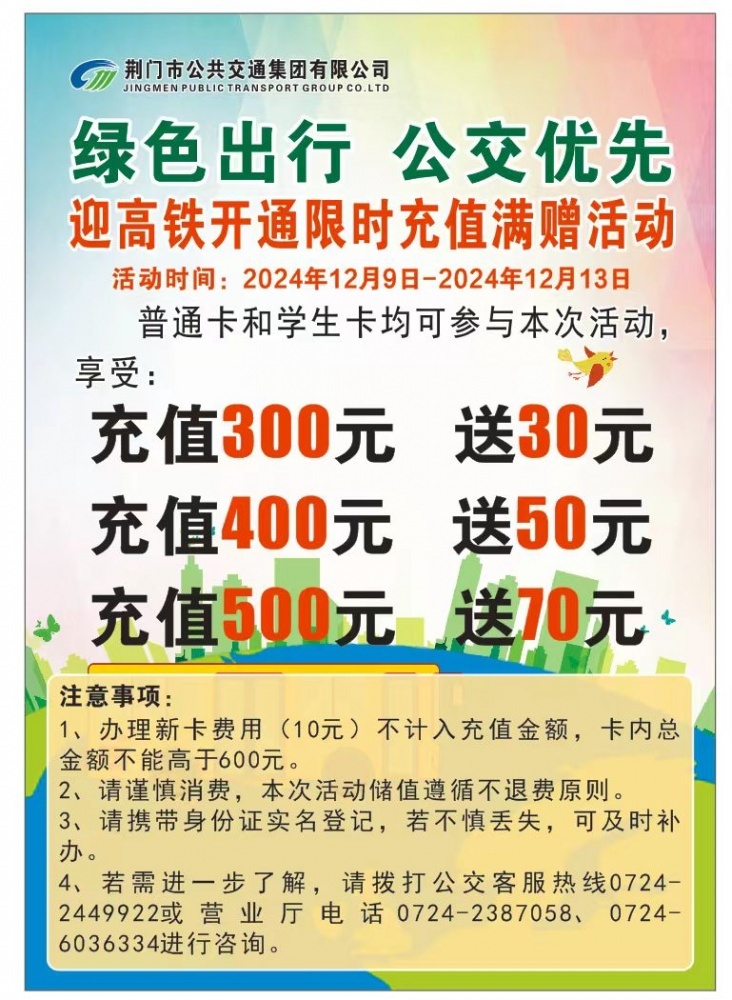 為迎接高鐵開通,荊門公交限時(shí)儲(chǔ)值活動(dòng)開啟,具體如下: