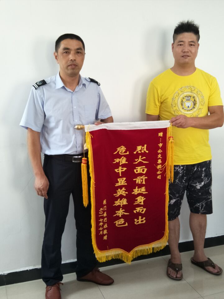 7月27日,荊門市旅行社出租汽車公司負(fù)責(zé)人及鄂H0A073的駕駛員專程來到荊門公交集團(tuán)公司,為果斷義舉滅火的公交陳旭師傅送上了一面“烈火面前挺身而出,危難中顯英雄本色”錦旗。