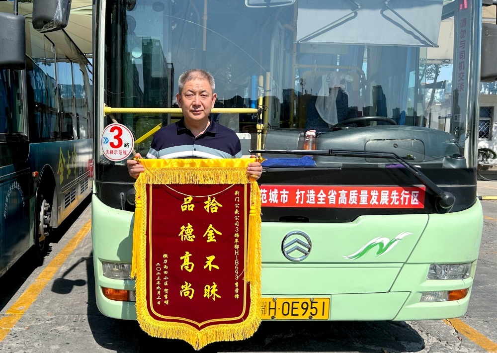 而另一邊,發(fā)現(xiàn)丟了錢包的賀先生在去往武漢的火車上著急萬(wàn)分,抱著不確定的心態(tài)打電話到客服調(diào)度中心詢問(wèn),看能否找回,誰(shuí)知火車才行至鐘祥站的時(shí)候,就接到了電話,說(shuō)錢包已找到,賀先生頓時(shí)放下心來(lái)。待賀先生從武漢歸來(lái)后特地送來(lái)一面錦旗以表示感謝,為公交培養(yǎng)出李學(xué)鋒這樣拾金不昧的駕駛員師傅點(diǎn)贊。