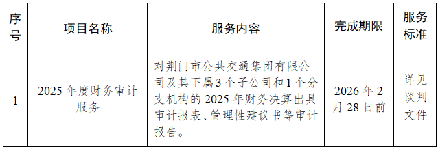 二、項(xiàng)目名稱:荊門市公共交通集團(tuán)有限公司2025年度財(cái)務(wù)審計(jì)服務(wù)項(xiàng)目